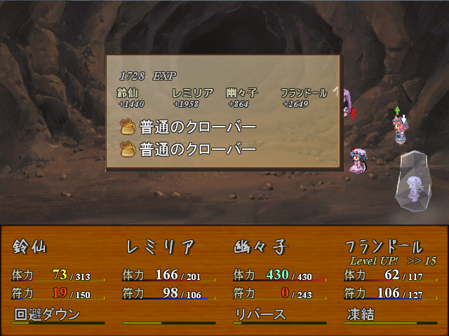 体験版で気付いた方もいらっしゃるかもしれませんが、敵パーティのメンバーの数が多いほど、すなわち団体さんの方が1匹で出てくるよりも苦戦するので、その分として経験値にボーナスが加算されていました。
