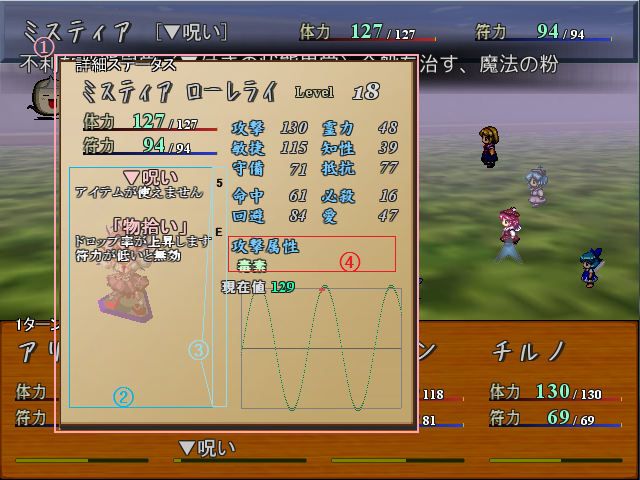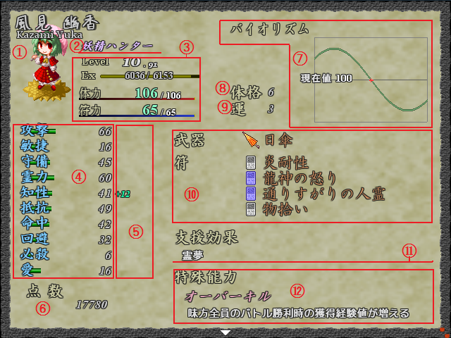 ③ レベル、経験値、体力、符力です。バトル等によって成長します
