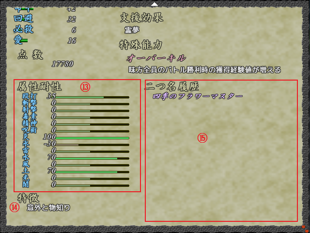 ⑬ 属性攻撃に対する耐性です。レベルによって成長することもあります