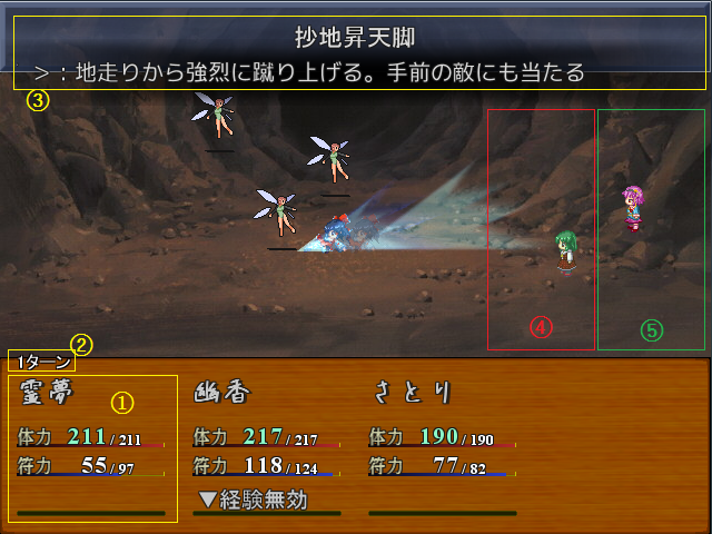 ④ パーティのうち前から2番目までは前列として配置されます。後列より狙われやすいです
