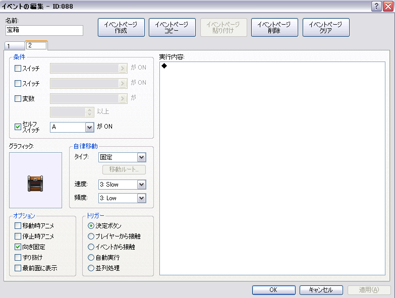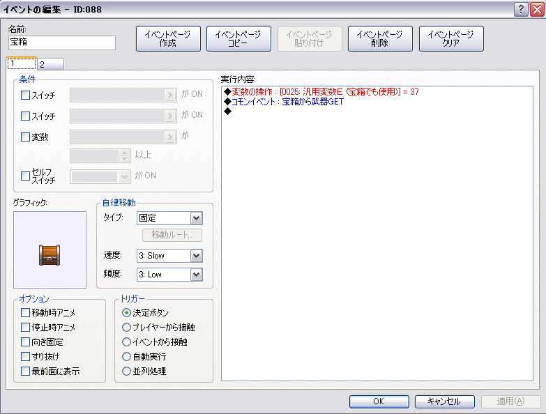 私の場合は、宝箱のイベントは雛形を作ってそこからコピペしていますが、